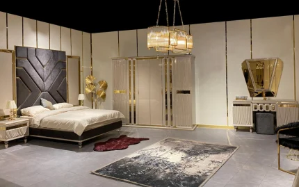 This exquisite, ultra-modern bedroom set is meticulously designed to infuse beauty and sophistication into your bedroom. It features a state-of-the-art wardrobe, a sleek bed frame, a stylish two-drawer commode, a timeless dresser, and an elegant dresser mirror.